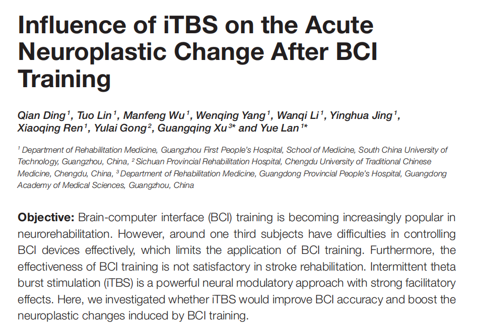 Ding Q, Lin T, Wu M, Yang W, Li W, Jing Y, Ren X, Gong Y, Xu G and Lan Y (2021) Influence of iTBS on the Acute Neuroplastic Change After BCI Training. Front. Cell. Neurosci. 15:653487. doi: 10.3389/fncel.2021.653487