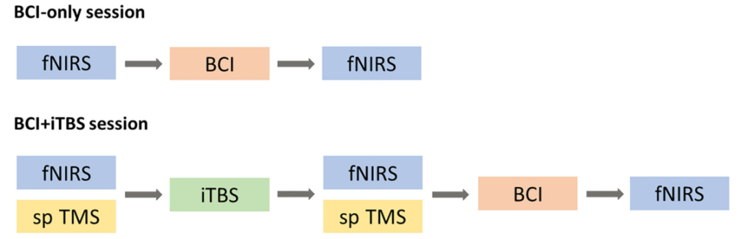 將健康受試者分為兩組,一組僅接受BCI訓練,并在訓練前后用fNIRS檢測腦區(qū)情況;另一組先進行TMS治療M1區(qū)后接受BCI訓練,fNIRS間斷檢測,具體實驗流程如下圖示: