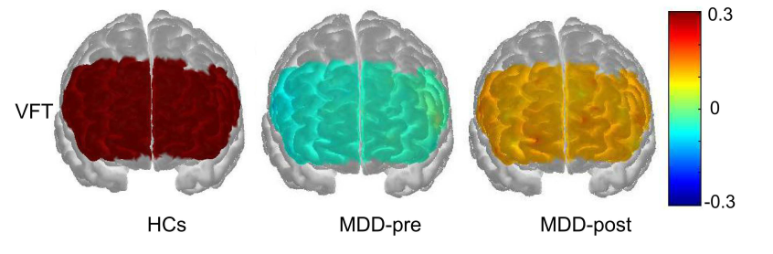 ? 經(jīng)2Hz右DLPFC經(jīng)顱磁刺激治療4周后,抑郁癥患者在VFT期間雙側(cè)額極前額葉皮質(zhì)(FPPFC)、腹外側(cè)前額葉皮質(zhì)(VLPFC)和左側(cè)DLPFC的HbO值增加。抑郁癥患者右側(cè)VLPFC從基線到治療后的HbO值的增加與經(jīng)顱磁刺激后HAMD評(píng)分的降低呈正相關(guān),見(jiàn)圖五。