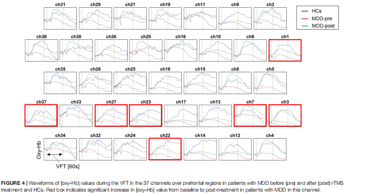 既往研究證明重復(fù)經(jīng)顱磁刺激(rTMS)治療抑郁癥良好的臨床效果;然而,其潛在的神經(jīng)機(jī)制尚不清楚。 近期,四川大學(xué)華西醫(yī)院鄭重教授帶領(lǐng)研究團(tuán)隊(duì)利用功能性近紅外成像(fNIRS)檢測(cè)經(jīng)顱磁刺激對(duì)抑郁癥患者前額葉皮質(zhì)活動(dòng)的影響,并發(fā)表在《Frontiers in Psychiatry》(IF=4.157)雜志上。