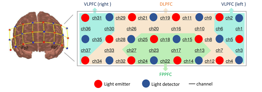 采用由武漢資聯(lián)虹康科技股份有限公司生產(chǎn)的37通道BS-3000近紅外腦功能成像系統(tǒng)測(cè)量大腦皮層中HbO和HbR的濃度變化。每個(gè)通道的距離為3厘米。采樣率設(shè)置為20Hz。
