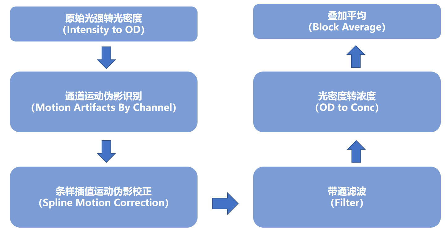 運(yùn)用Matlab軟件中的Homer2模塊進(jìn)行分析,取任務(wù)前10s作為基線期,先將原始光強(qiáng)轉(zhuǎn)化為光密度,使用0-0.1Hz的帶通濾波器對(duì)原始數(shù)據(jù)進(jìn)行濾波,以去除高頻噪聲;然后采用條樣插值方法去除運(yùn)動(dòng)偽影;最后運(yùn)用比爾朗伯定律將光密度轉(zhuǎn)化為HbO濃度。具體流程如圖三。