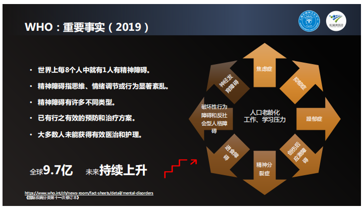 在精神障礙治療現(xiàn)狀分析中,王教授提到,根據(jù)WHO報(bào)道,世界上每8個(gè)人中就有1人有精神障礙,全球共有9.7億精神障礙患者, 未來(lái)仍然呈持續(xù)上升趨勢(shì)。