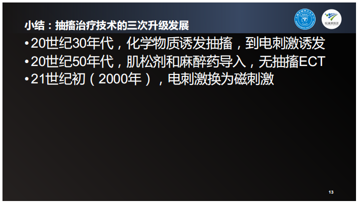 在抽搐治療技術(shù)簡(jiǎn)介中,王教授提到,抽搐治療技術(shù)經(jīng)歷了三次升級(jí)發(fā)展。第一次是20世紀(jì)30年代,化學(xué)物質(zhì)誘發(fā)抽搐,到電刺激誘發(fā);第二次是20世紀(jì)50年代,肌松劑和麻醉藥導(dǎo)入,無(wú)抽搐ECT(MECT)誕生;第三次是21世紀(jì)初(2000年),電刺激換為磁刺激。