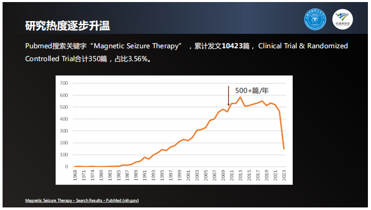 MST研究熱度逐步升溫,截止2023年底,Pubmed搜索關(guān)鍵字“Magnetic Seizure Therapy” ,累計(jì)發(fā)文10423篇, 最近10年每年發(fā)文500篇以上。