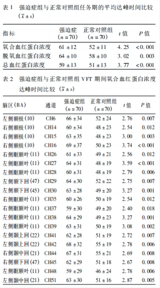 研究選取了70例符合 DSM-IV 強(qiáng)迫癥診斷標(biāo)準(zhǔn)的患者和 70 例正常對(duì)照,應(yīng)用近紅外腦功能成像技術(shù)(fNIRS) 測(cè)評(píng)完成 VFT 時(shí)前額葉及顳葉血流的變化。比較兩組完成任務(wù)時(shí)氧合血紅蛋白 ( oxy-Hb) 、脫氧 血紅蛋白及總血紅蛋白 ( total-Hb) 濃度達(dá)峰時(shí)間的差異。