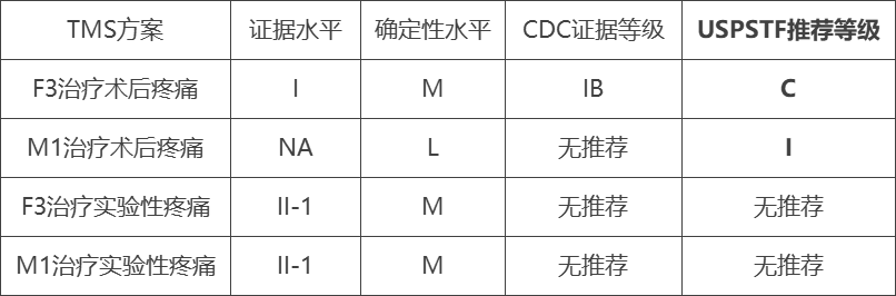 TMS治療急性疼痛的研究有高頻(5Hz或10Hz)也有低頻(1Hz),刺激部位有左前額葉背外側(cè)區(qū)(F3),也有原始運動皮質(zhì)(M1區(qū)),多個研究結(jié)論不一致。