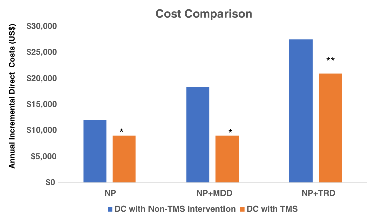 對于嚴(yán)重的耐藥抑郁癥,每年進行70次治療(急性和維持rTMS),1年的費用為21,000美元,5年的費用為105,000美元。