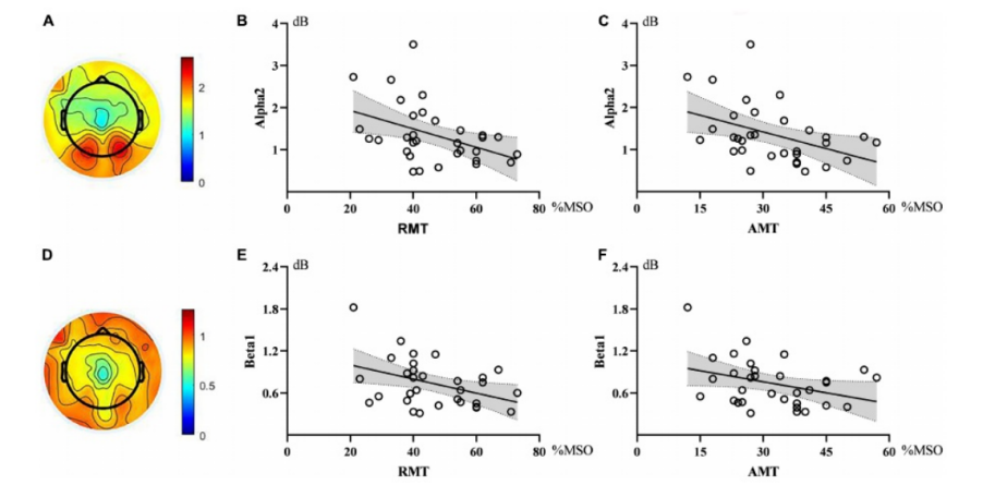 地形圖顯示了alpha2振蕩和beta1振蕩的功率。散點(diǎn)圖顯示了腦電圖(EEG)振蕩與運(yùn)動(dòng)閾值(B,C,E,F(xiàn))之間的相關(guān)性。Alpha2與RMT、AMT均呈顯著負(fù)相關(guān)。