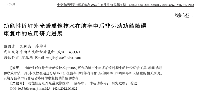 2022年,武漢大學(xué)中南醫(yī)院廖維靖教授研究團(tuán)隊(duì),對(duì)fNIRS在該方面的研究進(jìn)行了綜述,發(fā)表在《中華物理醫(yī)學(xué)與康復(fù)雜志》上。