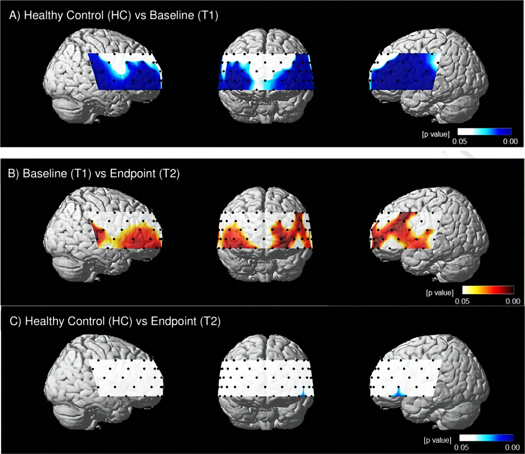 4、對(duì)抑郁癥采取電休克治療(ECT)的療效和耐受性已被廣泛認(rèn)同,但ECT對(duì)大腦功能的直接影響尚不清楚。Hirano等人[4]的一項(xiàng)研究闡明了ECT后皮層功能反應(yīng)對(duì)認(rèn)知任務(wù)的變化。研究使用了fNIRS來(lái)檢測(cè)30例重度抑郁癥或雙相抑郁患者在ECT治療前后與108名健康對(duì)照者(HC)的變化。結(jié)果與HC組相比,發(fā)現(xiàn)在ECT之前,患者的雙側(cè)額葉皮質(zhì)在VFT中顯示出[oxy-Hb]值明顯降低。而在ECT之后,患者組的雙側(cè)額葉皮質(zhì)在VFT中的[oxy-Hb]值明顯增加,且與HC組無(wú)太明顯差異。因此,額葉區(qū)功能對(duì)認(rèn)知任務(wù)的異常反應(yīng)可能與ECT治療抑郁癥的療效有關(guān)。
