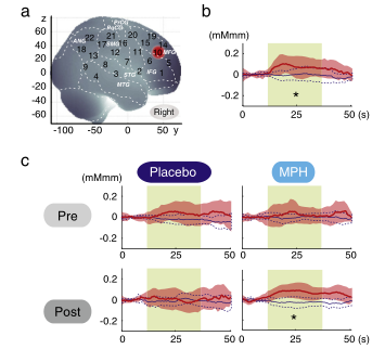 3、Monden等人[3]通過(guò)fNIRS測(cè)量12名注意缺陷多動(dòng)障礙(ADHD)兒童在服用哌甲酯(MPH)前后1.5小時(shí),被試進(jìn)行GO/NO-GO任務(wù)時(shí)的外側(cè)前額葉皮質(zhì)血流變化。結(jié)果發(fā)現(xiàn)在MPH攝取前,患者的外側(cè)前額葉皮質(zhì)(LPFC)沒(méi)有顯著的激活。在MPH攝入后,患者的右外側(cè)前額葉皮質(zhì)檢測(cè)到[oxy-Hb]的顯著增加。研究結(jié)果表明認(rèn)知能力的改善與右側(cè)LPFC的激活有關(guān),LPFC可作為監(jiān)測(cè)ADHD兒童服用MPH效果的生物標(biāo)志。