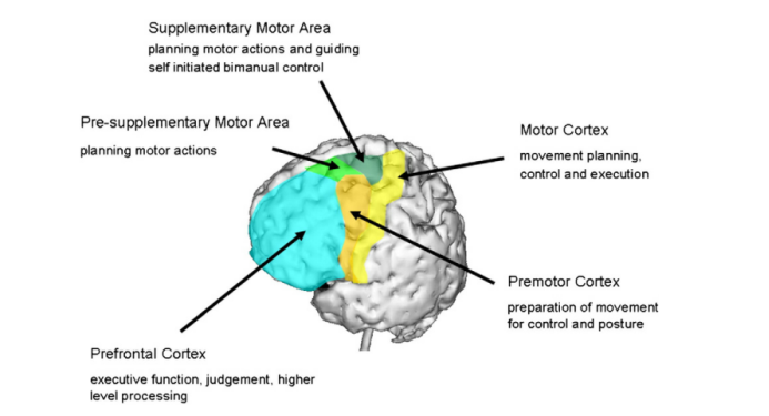 由于人類皮層的運動區(qū),即初級感覺運動皮層(primary sensory - motor cortex, PSMC)和運動前皮層(pre - motor cortex, PMC)位于離頭皮組織較近的位置,因此很容易進行光學測量。此外,用于復(fù)雜運動學習和運動控制的高級加工(如判斷、規(guī)劃、錯誤檢測)的前額葉皮層(PFC)也可以通過fNIRS快速獲取。圖1為在三維解剖MRI圖像上描繪的人類大腦皮層中每個運動相關(guān)區(qū)域的大致位置。