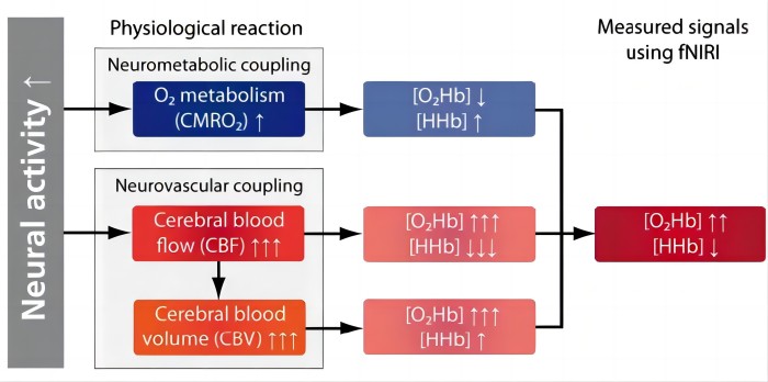 fNIRS基于神經(jīng)-血管耦合機(jī)制的原理工作。眾所周知,大腦不儲存能量,神經(jīng)元活動所需的所有能量都來自血液供應(yīng)系統(tǒng)的實時供應(yīng)。