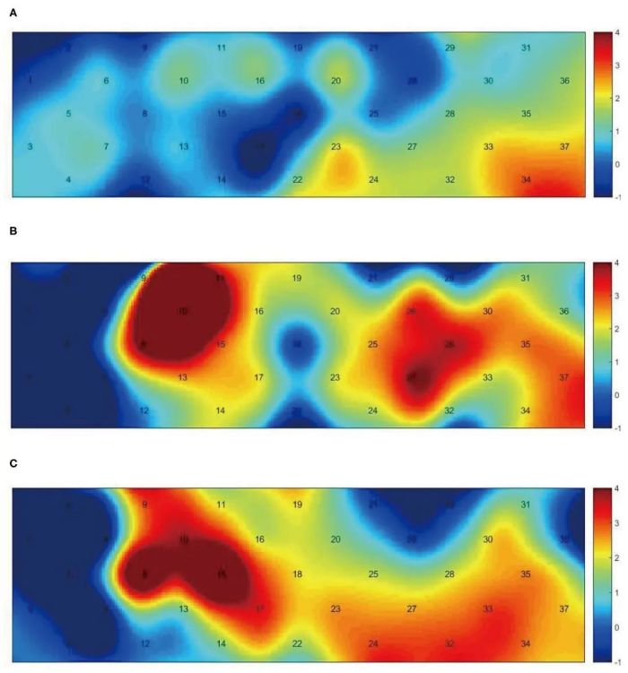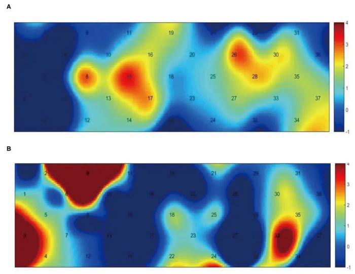 圖4:步態(tài)任務(wù)中通道激活t-map的組間方差(p < 0.05)