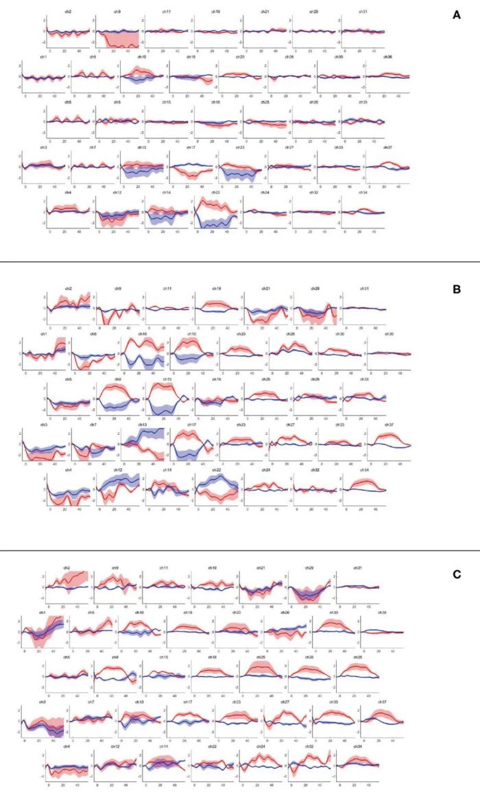 紅線(xiàn):HbO濃度,藍(lán)線(xiàn):HbR濃度。