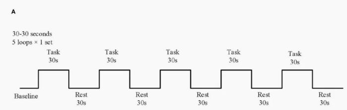 準(zhǔn)備期間,受試者以站立姿勢(shì)休息10秒。任務(wù)期間,聽(tīng)到“走”的命令,受試者首先踩右腿,交替行走30秒,當(dāng)聽(tīng)到“停止”命令時(shí),受試者停止行走并以站立姿勢(shì)休息30秒。此過(guò)程重復(fù)了五個(gè)循環(huán)。流程如圖所示: