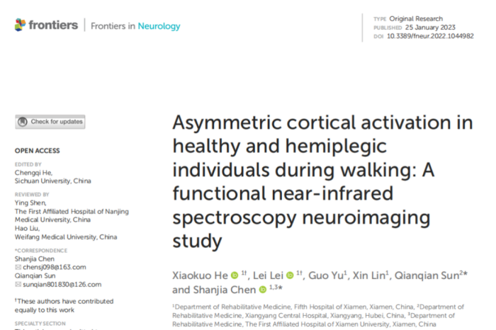 2023年,廈門(mén)市第五醫(yī)院康復(fù)科何曉闊教授團(tuán)隊(duì)在《Frontiers in Neurology》上(IF=3.4)發(fā)表了一篇文章,該文利用近紅外腦功能成像技術(shù)(fNIRS)調(diào)查了健康和偏癱行走過(guò)程中運(yùn)動(dòng)控制的皮質(zhì)激活機(jī)制。