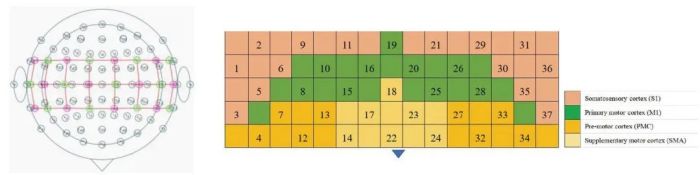 2. 試驗(yàn)設(shè)備:利用武漢資聯(lián)虹康37通道的fNIRS設(shè)備采集基線(xiàn)期和任務(wù)期被試前運(yùn)動(dòng)皮層(PMC)、輔助運(yùn)動(dòng)區(qū)(SMA)、初級(jí)運(yùn)動(dòng)皮層(M1)和初級(jí)軀體感覺(jué)皮層(S1)的腦激活情況,其中M1和S1統(tǒng)稱(chēng)為感覺(jué)運(yùn)動(dòng)皮層(SMC)。